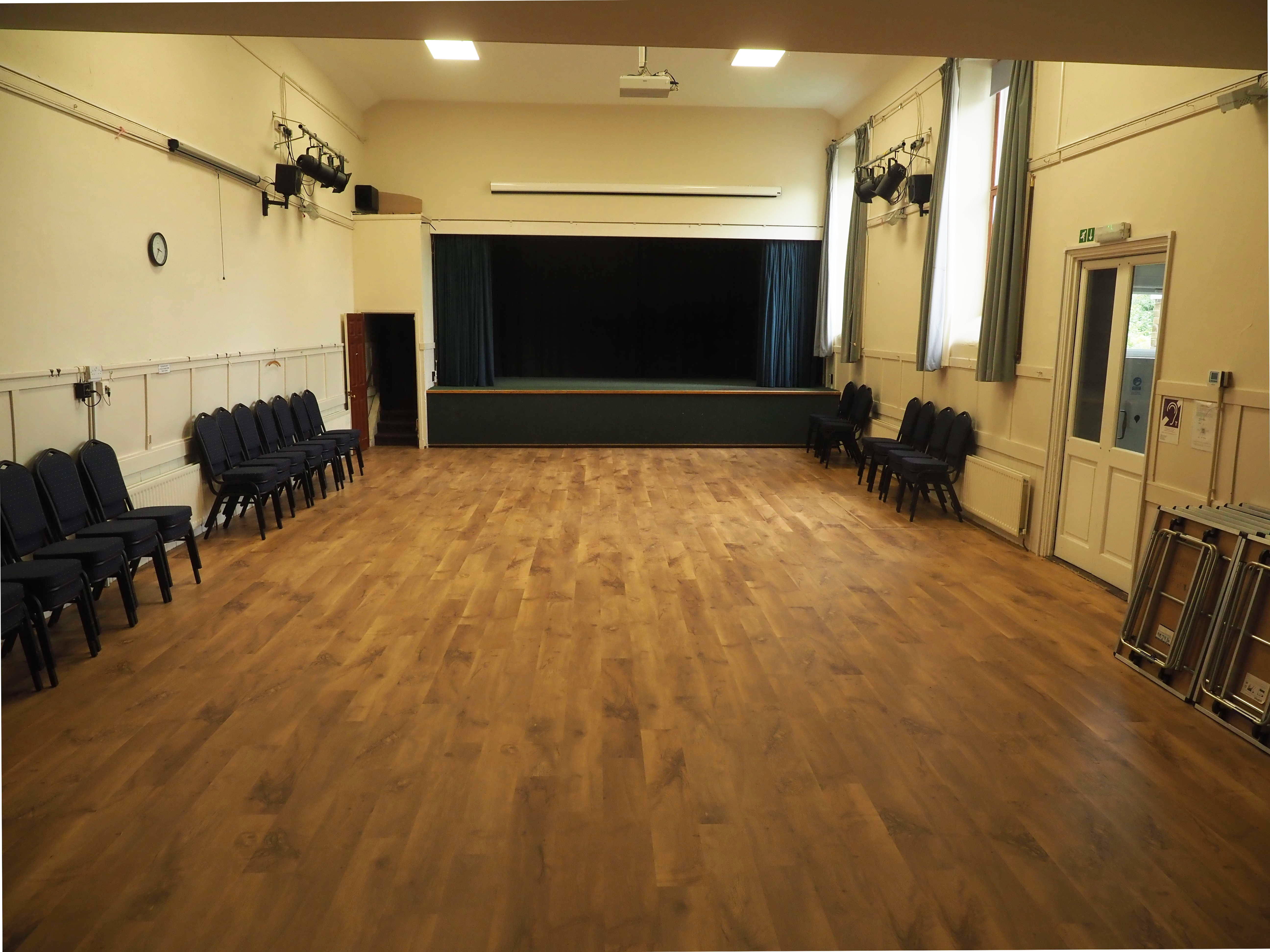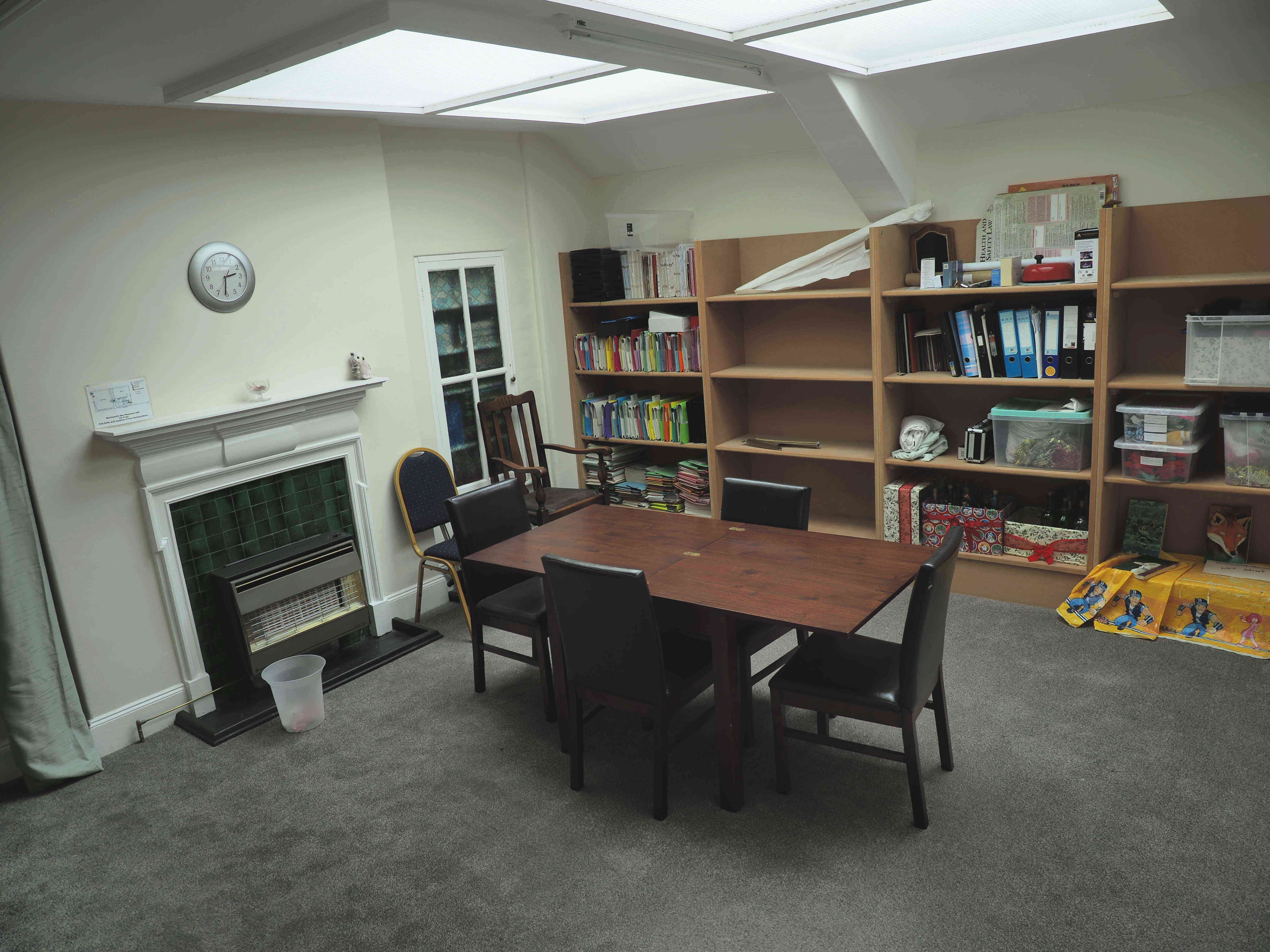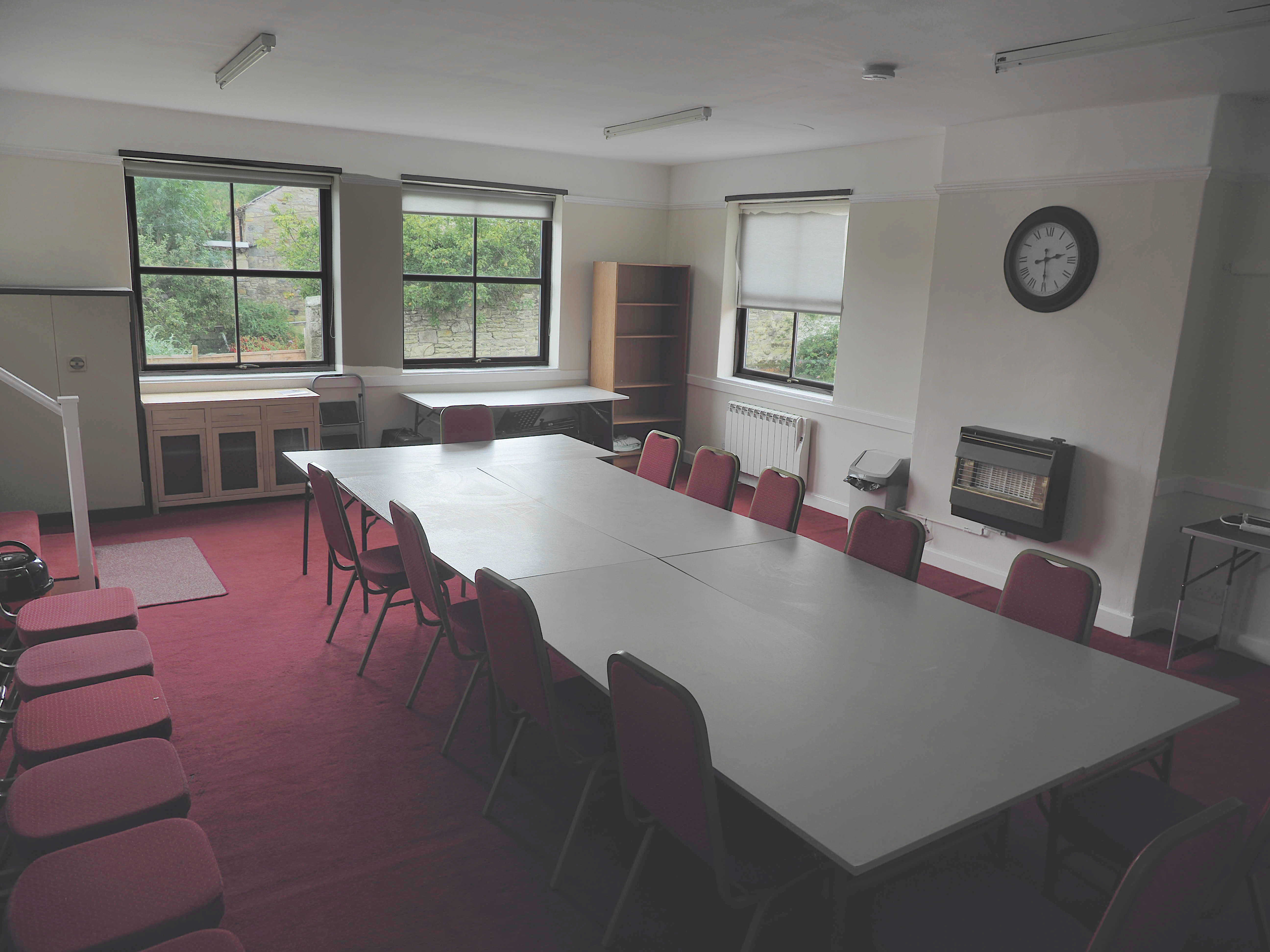 This room is available for general use. It is accessed by a flight of stairs.It measures approximately 6.4 x 4.5 metres. It has 6 collapsible tables (each measuring 178cm x 75cm), 20 chairs and a conventional gas fire. It is ideal as a meeting room for up to 20 people. WiFi is available in the hall, but you will need to power on WiFi boosters - see notice board for details.