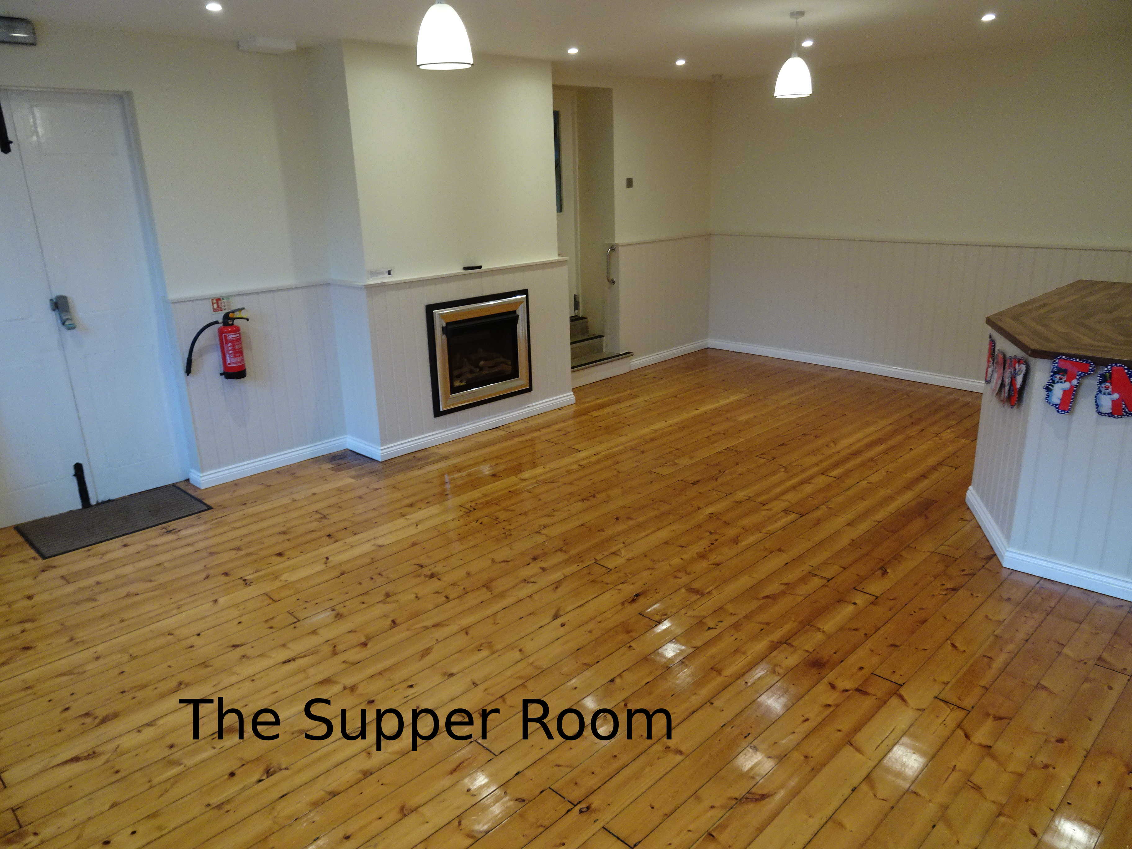 - Supper Room: access via four steps with handrail from Main Hall or via three steps with handrail from Kitchen level. If necessary, ground level access is possible via external fire escape doors.
